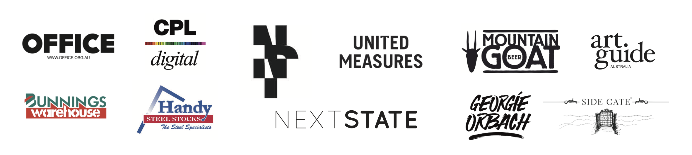 Exhibition design by OFFICE and materials supplied by Handy Steel Stocks, paint supplied by Bunnings Warehouse, Collingwood. We are generously supported by our Event Partners: CPL, United Measures, Negative Press, and Next State. Our opening event is supported by Mountain Goat Beer, Side Gate Wines, and Georgie Orbach Wines. Media support by Art Guide Australia and graphic design by Louie Dodd.