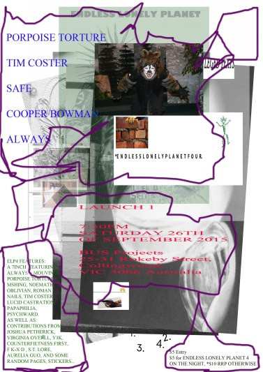 Endless Lonely Planet is a yearly periodical, interested in the format of a year in time. With ongoing and new contributors having the loose deadline of a year to work within, mostly… Each issue explores a different binding, and accompany formatted recording.Issue 4 coming with a 7inch record featuring tracks from Tim Coster, Alwayse, Mshing, Lucid Castration, Noematic Oblivion, Mouving, Porpoise Torture, Roman Nails, Papaphilia, and Psychward.