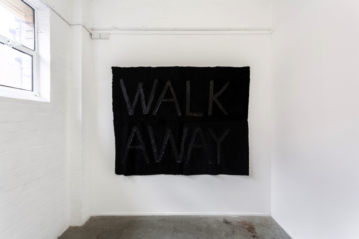 Ruby Brown’s practice is influenced by Māori mythology, pop culture and anthropology and explores the fleshy weight of boundaries, spaces, lines and labels. Brown is a collector of objects and imagery discovered along walking tracks and conversations recorded during random street-encounters, travelling by taxi or public transport. Back at the studio, collections are fragmented and reborn through sculpture, paint and action, exploring fibrous unions between anthropological ideas and materiality. This work sees the introduction of monochromatic text as an instruction, a rule, or a signpost for those negotiating liminal spaces.