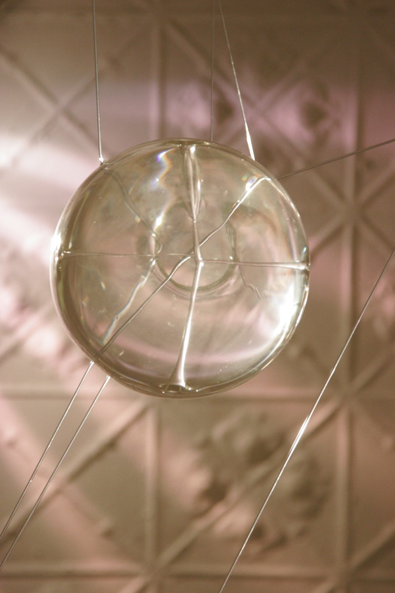 The vast architectural space of fortyfivedownstairs defines the framework for Emma Lashmar’s site-specific string instrument. The resounding of the harp/cello-like strings as they are plucked and bowed creates an audible shadow-echo of the room. A second set of strings strung with hand-blown glass spheres filled with water vibrate in response to the sounds created. The direct physical response produced by the water within these transparent objects or bodies is a visible effect that correlates to the listeners’ experience of the sounds created.