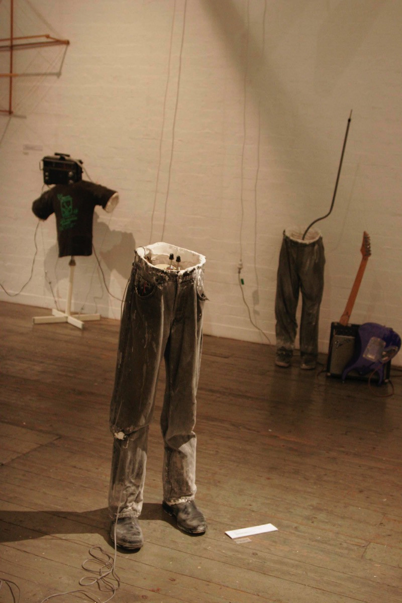 Each of Rod’s subjects has donated items of personal clothing for this project. Plaster-coated T- shirts, pairs of pants and shoes capture the presence of each artist. Junk apparatus and specific choices of material provide insight about the artists’ performance style. The reciprocal exchange of dialogue and objects between Rod Cooper and his subjects creates a secondary presence in sound, material and entity.