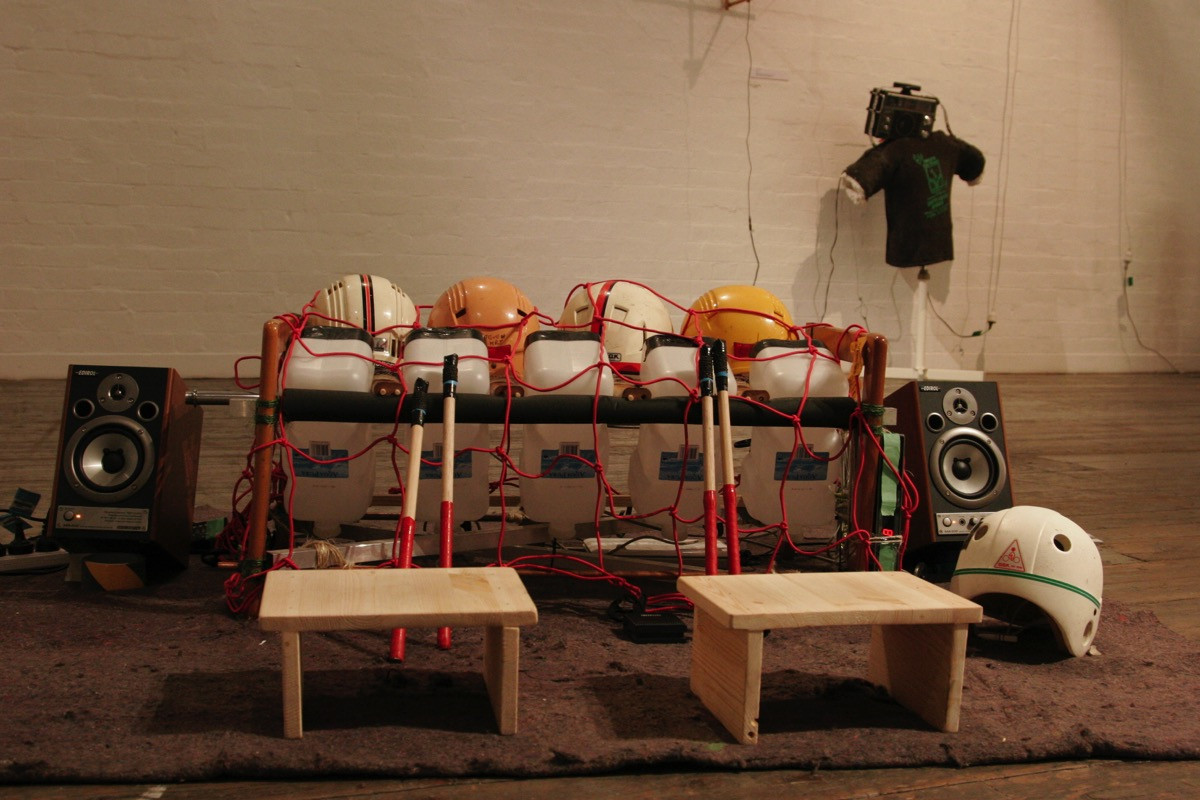 Alesis trigger, aluminium, bucket, chair, copper, dowel, Edirol MA20s, foam, helmets, mat, MSI Wind U200, mover’s carpet, net, piezos, RCA to 3.5mm cable, rope, tape, USB cables, water bottles.